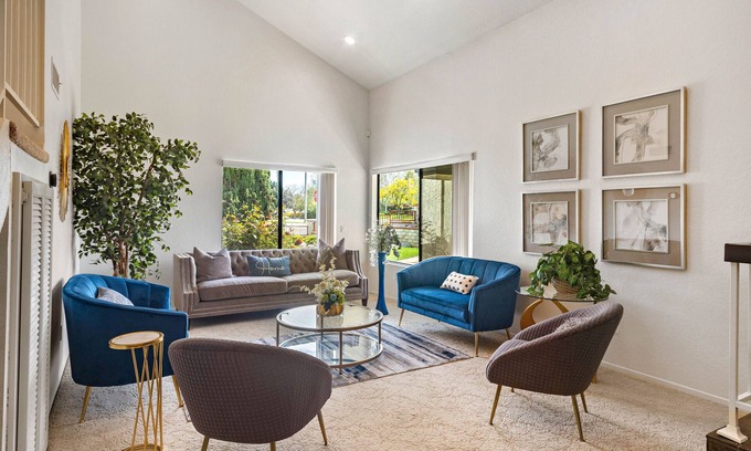 Upon entry, you are greeted by an expansive living room with cathedral ceilings, chandeliers, and gorgeous wood beams. The home has been tastefully renovated with many eclectic furniture pieces that are just right for the space and environment. This living room has a large sitting area with modern couch. Large windows here allow beautiful natural light in along with the amazing sunset/ sunrise and rose garden views.