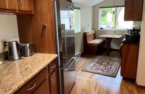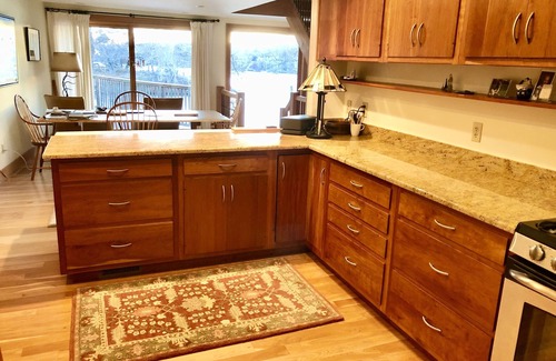 Light streams in the large windows that look out on the pond and plantings. Access to canoe and dock on pond. Outdoor shower and grill. Inside all necessary amenities with comfortable beds. Full kitchen and 2 full baths. Towels for beach and parking pass for local beach.
