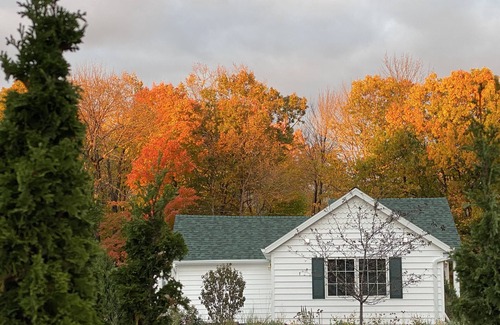 The APPLE RETREAT is one of two wonderful recent renovation. I spent most of 2021 creating an elegant and charming place to enjoy in all seasons. A private entrance leads to three over-sized rooms, a very large living room with beamed 14-ft cathedral ceiling, all with great windows and light. The living room TV has AmazonPrime, Hulu, Cable etc, and there are also some board games, books etc. A dining-room/kitchen with table for six and a large kitchen island complements the beautiful full kitchen, with microwave, dishwasher, oven and fridge/freezer. Finally there's a very spacious bedroom with King bed and luxury linens, with closet space and en suite bathroom (with tub/shower combo). The home also has a separate powder room. Outside, there is a pretty, enclosed private covered porch immediately outside the dining area, separated from it by three large picture windows. Great for relaxing outside on the evenings. In the daytimes, light streams into the living room and dining areas, making the place feel spacious and relaxed. This impression of space is greatly enhanced by the cathedral ceilings in both the living and dining rooms - rising to 14 feet at their peak. Most of the floors are in an elegant wood finish; the bedroom is carpeted. The house sleeps up to 4: That is: 2 in the King bed, and then a high-end Queen sofa-bed in the living room provides sleeping for 2 more when needed. Rather than creating additional smaller bedrooms, I decided to keep the place generous in proportion, so that guests can really spread out and not feel cramped. The landscaping round the house and in the whole Green Gables complex is almost an obsession for me, and continually a work in progress! - and is already quite stunning. For instance, I planted over 30,000 spring bulbs at Green Gables by hand last Fall!