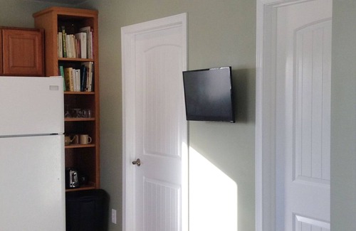 The bedroom is warm and inviting, with a comfortable queen-sized bed and bedding, latté colored walls, espresso lamps, and chocolate blackout curtains. Along with the 40" smart TV, it has a writing desk equipped with writing paper, Sage Cottage postcards, coloring pages for the young and young at heart, and colored pencils.