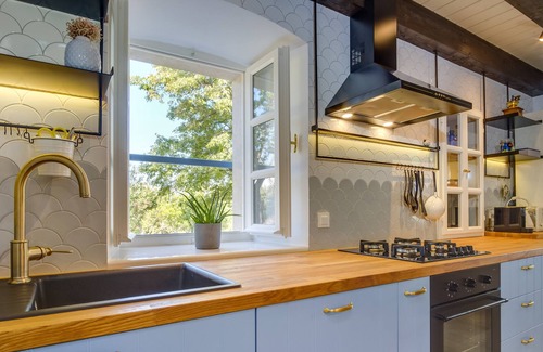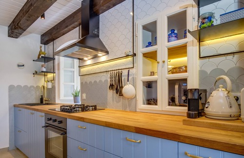 The ground floor of the antique stone house consists of a spacious living and dining area, as well as a commodious kitchen. The kitchen features the fridge, stove, dishwasher, microwave, coffee machine, and all sorts of kitchen utensils you may need (toaster, kettle...), as well as herbs from the garden (oregano, rosemary, laurel…).