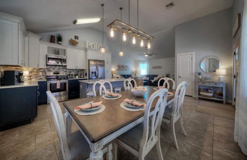 Walk into a gorgeous open floor plan with a spacious kitchen, very well stocked for the cooks to prep, cook, serve and dine, an oversized living space with ample seating, and a large dining area with a kitchen island bar and stools which means plenty of seating for 10!