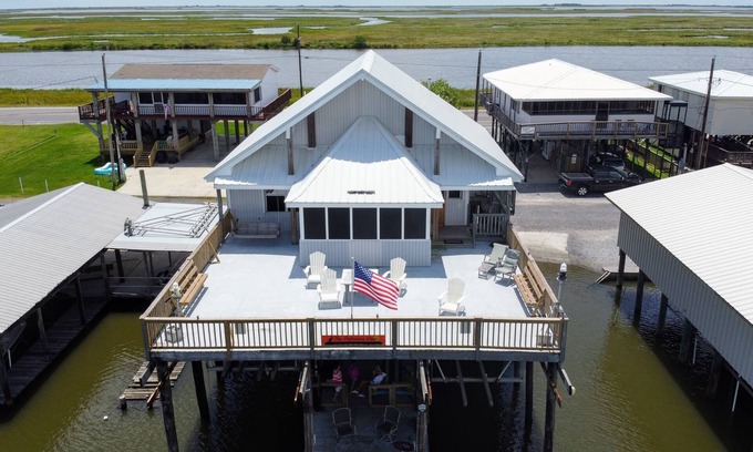 Suspended over the water in the quiet fishing neighborhood of Cocodrie, Pelican View Lodge is a wonderful place to relax. This 2 bedroom, 1 loft, 2 ½ bathroom lodge sleeps 12 people comfortably: