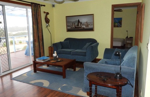 2 bedrooms with queen sized beds , 3rd bedroom has 2 single beds,1 single bed room, quality linen throughout. 1 en suite bathroom and 1 main bathroom with bath. Lounge has large TV with DVD/CD/video players. Main bedroom has TV/DVD/ USB port. Fully equipped kitchen and laundry (no tumble drier but washing line outside. BBQ on back veranda. Large outdoor parking area. Room to park your boat. Fish cleaning facility available. Ceiling fans for cooling in summer.