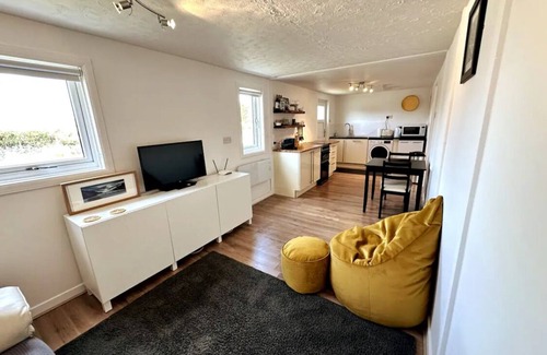 >Open kitchen/living dining area with combined washer dryer/small fridge freezer, dishwasher & microwave.