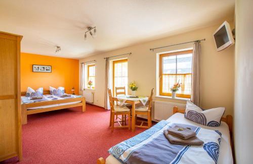 Enjoying a peaceful location on the outskirts of the Saxon town of Freiberg, this guest house invites you to discover the Medieval charm of the town as well as the wonderful scenery surrounding it. The Pension Ferienhof Fischer offers bright, modern bedrooms and apartments, as well as a large terrace, beer garden and barbecue area. Younger guests will enjoy the playground and the petting zoo. There is cozy pub at the guest house which serves a range of freshly cooked meals. The picturesque Saxon countryside is best explored on foot or by bicycle.