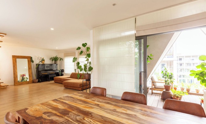 A private elevator opens directly into the sunlit living space, leading to a plant-filled, roofed terrace. Perfect for morning coffee, evening drinks, or quiet outdoor work. Relax on the large sofa, play a tune on the piano, or cook in the fully equipped kitchen with dishwasher, coffee machine, and everything you need for home-style meals.