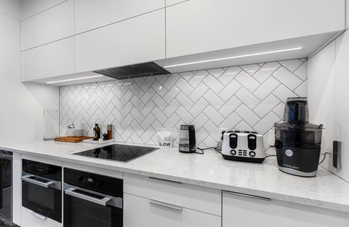 Penthouse Prestige has been thoughtfully decorated to ensure a premium stay while being perfectly positioned to be filled with natural light. Your open-plan living space is comprised of a high-end, modern kitchen equipped with stone benchtops, a centre-island bench and quality appliances, while the space effortlessly flows through to your dining and living space. Furnished with comfort in mind, relax and unwind on the lush couches while enjoying the convenience of a Smart TV and WiFi.