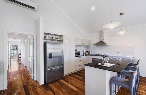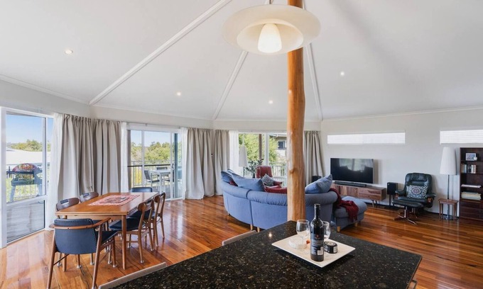 Inside, the light-filled open-plan living area features a striking vaulted ceiling, polished timber floors, and expansive windows that bring the coastal surroundings indoors. Unwind on plush sofas in air-conditioned comfort, stream your favourites on the smart TV, or enjoy a board game night with the family. The chef’s kitchen is fully equipped with European appliances, stone benchtops, and everything you need to cook up a feast, while the dining area makes mealtimes easy and social.