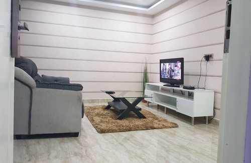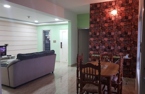 Modern, Fully furnished well decorated 2 BHK , Airconditioned bedrooms fitted with Queen beds, Computer table, chair and TV. One of the bedroom comes with attached bathroom.
