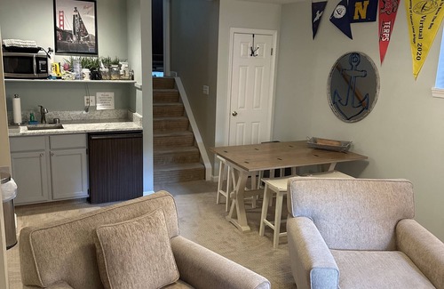 Comfy large space with sectional sofa, oversized TV, wireless internet, a pool table with ping pong overlay and plenty of games to keep everyone busy. Walk to town, Annapolis or Eastport Yacht club, Mears Safe harbor marina or Davis pub for a crab pretzel. All within a block or 2 of our apartment.