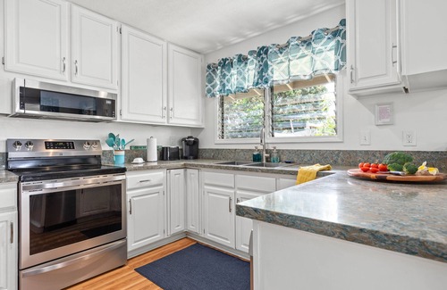 The spacious living room has a large screen TV with high-speed internet providing the ability to connect to Netflix, Hulu or other apps. It also has high-speed ceiling fans and a split air conditioner to ensure your comfort during the heat of the day. Another bonus is a connecting game/dining room with a large table perfect for puzzles or games that is decorated with a stunning traditional Hawaiian ceiling.