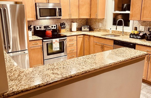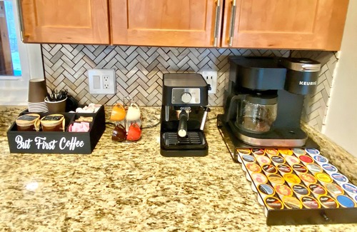 This beautiful home boasts a fully equipped kitchen with stainless steel appliances and granite countertops. Enjoy tasty dinners at home or take advantage of the many neighborhood restaurants that offer hassle free delivery. From the moment you step through the door, you'll be wowed by the fully stocked coffee bar complete with an espresso machine and duo Keurig coffeemaker for coffee, tea, and hot chocolate. And for breakfast? Why not indulge in something special from our waffle bar? In addition, no need to worry about ingredients, we've got you covered. All your favorite spices, condiments and oils so you are provided to make cooking a breeze.