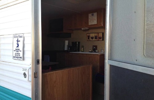 Ever wonder what it's like to stay in an RV. Vintage RVs surrounding a open and picturesque patio. Each RV sleeps at least 2, there are twin beds in the larger RVs. And if you need more room, there are couches to sleep on and a table that will covert to a bed in the RVs. And the cabin itself will sleep up to 9. There is a fully functional kitchen in the main cabin and grills for outside cooking. There is a bath house for showering and laundry. Or you can use the shower in the Cable Cabin shower. There is no hot water in the trailers, but the showers do work. Everything has AC and Wifi.