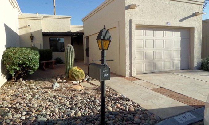 Whether you want to escape the snow and cold or just enjoy the Arizona sunshine this is the place! Perfect in winter, but nice In summer! Enjoy the Arizona sunshine in this nicely furnished and decorated townhome. Stylishly decorated. Centrally located in Green Valley close to shopping, golf, churches, and GVR social centers. Lots of natural light via windows and skylights. Skylights in all rooms but bedrooms. Great views of the Santa Rita Mountains from the private enclosed backyard patio, covered patio, living area, dining room, and primary bedroom. Both the primary bedroom and the living room have sliding glass doors that open onto the private backyard/patio.