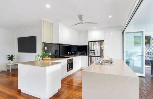 This beautifully renovated Queenslander haven showcases impressive indoor and outdoor living, just a 10-minute drive to the Cairns city centre. Designed with contemporary, free-flowing interiors, the retreat extends to an idyllic outdoor entertaining area overlooking the sparkling pool and lush backyard. Whether sharing lunches outdoors, cooling off with a swim, or preparing gourmet meals in the sleek kitchen, this home invites you to embrace the best of tropical living in Far North Queensland.