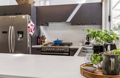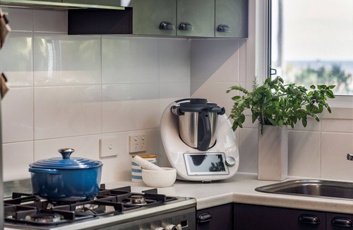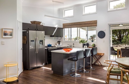 The open plan living, dining and kitchen offers glimpses across the lush lawn and charming white picket fence to the bay and accesses the spacious covered alfresco area. An outdoor setting and BBQ makes this the perfect chill out zone at the end of a fabulous beach (or winery tour) day and the lawned area is the perfect place for kids to play. The kitchen includes gas cooktop, electric oven, thermomix, dishwasher and Nespresso coffee machine.
