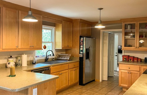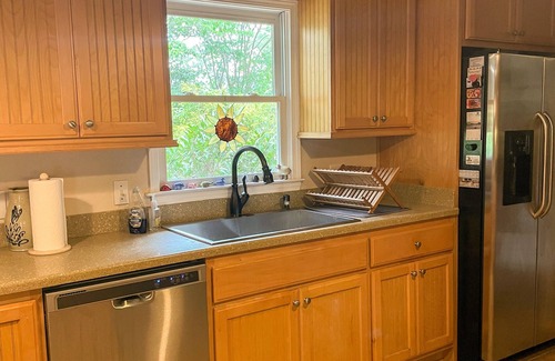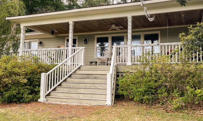 Our home has three bedrooms, all on one level and ramped for easy access. It has a modern kitchen conveniently connected to a dining area suitable for 6-8. The spacious 1900 square foot home has two bedrooms on one side of a great room, one with a Queen-size bed, another bed. At the other end of the house the third bedroom has a twin bed, a queen bed, a washer and dryer, and a den/television room with a pull-out sleeper sofa and recliner A deck runs the full length of the river/marsh side of the house, with a southern exposure, grill, porch swing, and a modern hot tub. Guests may use two kayaks (one tandem, one single), and a bicycle. Dogs are welcome, if on a flea/tick preventer. Our dog, a keeshond, loves it; yours will too. House has wifi (password-protected) and two smart televisions, one DVD. Lots of books on shelves in the great room are available for guests to browse and enjoy.