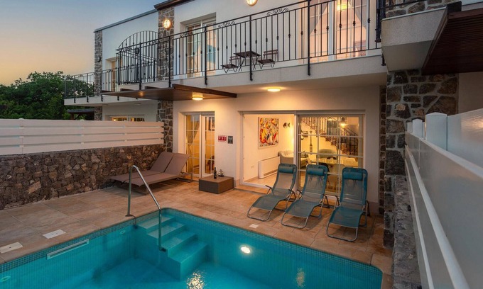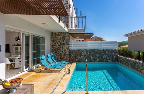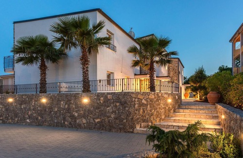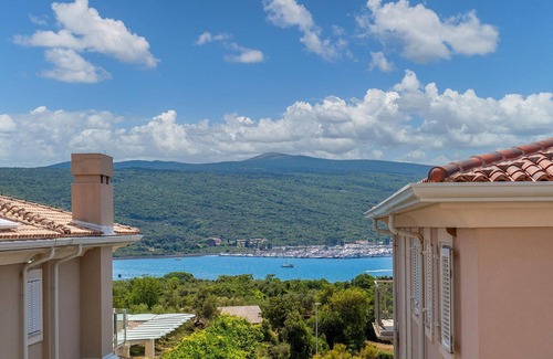 This wonderful holiday home with pool is located on the island of Krk in the small village of Korni. It is about a five-minute drive from the historic town of Krk and the town of Punat with its well-protected harbour. Due to its hilly location, the house offers a fantastic view of the sea and the olive groves for which the region is famous. The lovingly furnished house is built in typical island architecture and consists of a successful mix of modern and traditional elements. From the living room you have direct access to the terrace with barbecue, lounge and sunbathing area and heated pool. The master bedroom is on the ground floor and the other two are on the upper floor. The house is air-conditioned, has underfloor heating and there is also parking space on the large, fenced plot.