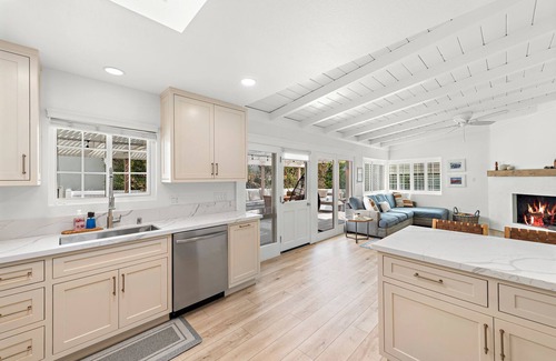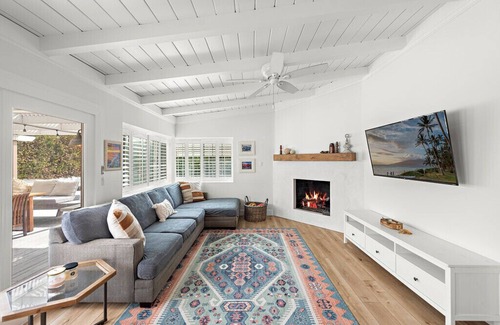 This amazing beach haven embraces the highly sought after beach retreat lifestyle. Step inside to find a fresh and inviting interior with newly painted walls, elegant durable vinyl wood flooring, and a stunning brand new fully equipped kitchen. Embrace the ultimate outdoor retreat with an expansive backyard and patio, perfect for hosting gatherings or unwinding under the sun. Relax in the cozy living room, warmed by an open fireplace, beamed white ceilings and multiple windows that create a bright and airy ambiance. The two comfortable bedrooms, each with tastefully remodeled bathrooms, offer modern amenities and a clean design for your ultimate comfort. The generous primary en-suite bathroom also includes washer/dryer. Outdoors, you'll discover an expansive paradise awaiting you. The massive private patio and backyard provide ample space for outdoor gatherings, relaxation and recreation. The prime location of this property speaks for itself, just minutes away from the beach and the local shopping center. It is walking distance from Pines Park which offers sunsets, playgrounds and a beautiful lookout. Conveniently located close to restaurants, shopping and a fan favorite poke place, this newly remodeled beach cottage is the epitome of style, comfort, and coastal charm.