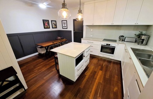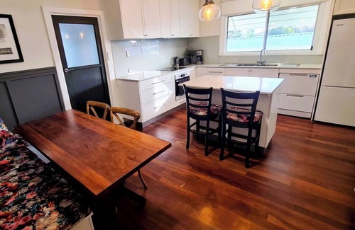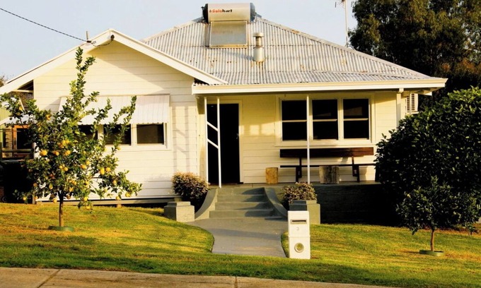 This cottage has been fully renovated and despite the spacious block, chirping birds and rural vibe, is walking distance to shops and pubs. It offers reverse cycle air-conditioning throughout, fire place, fire pit, bbq, outdoor dining, playground and much more.