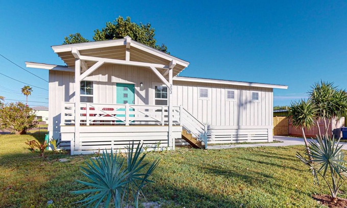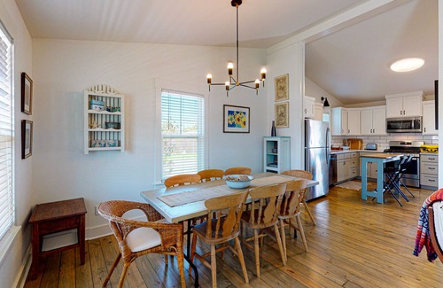 Studio Sea is a newly constructed adorable home located near town decorated with beach cottage decor. Upon entry to the house there's an instant sense of cozy and calm as you walk through the living room area with comfortable sofa sleeper, chairs, a large screen TV, cable and Wifi. The full kitchen is well equipped with all you will need for preparing that special meal for your family and/or friends. It features a gas top stove, stainless steel appliances, beautiful counter tops, & led track lighting. The dining area has seating for 8. Both bedrooms are just down the hallway. The master bedroom (BR1) offers a king bed, flat screen TV. The en-suite master bath is equipped with a modern tile shower with sliding glass door. The second bedroom (BR2) has a set of twin bunk beds and a full bed along with a flat screen TV. For your convenience the stack-able washer and dryer combo is located just off the kitchen tucked neatly in a closet. There is a spacious, covered, outdoor patio with evening shade and a picnic table that is perfect for grilling on the provided charcoal grill. The backyard is fully enclosed and fenced for your privacy. Pets are considered, perfect with the enclosed yard. Large driveway for Boat or RV parking. This home has everything on the checklist for for a fantastic, fun-filled getaway close to shops and restaurants and a 3 minute ride to the beach.