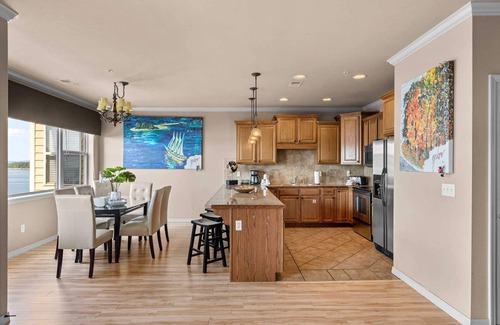The fully-equipped kitchen comes with everything you need to make your favorite meal - you just provide the food! There's plenty of counter space on the granite countertops, and the stainless steel appliances are all full size, including the dishwasher. The dining room table seats six, and there is also additional space at the breakfast bar. The views of the lake from the dining room windows are incredible! This property also includes a washer and dryer.
