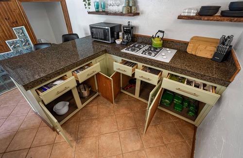 The entrance to the guesthouse brings you into a high beamed ceiling, fully stocked kitchen with easily accessible dinnerware. High-top seating is provided to enjoy kitchen socialization or a quick meal. Please be aware there is a stove, but no oven.