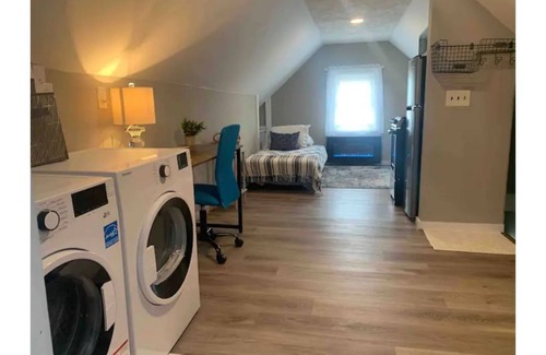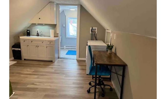 Small studio apartment in the attic with a private entrance and smart locks. Walking in it's small but very cute and clean. Welcomed by a very cool and modern electric fireplace, air conditioning unit, full kitchen, and FREE laundry in the unit! Wifi is quick and included with everything you need to work or play in the Western Maine hills.