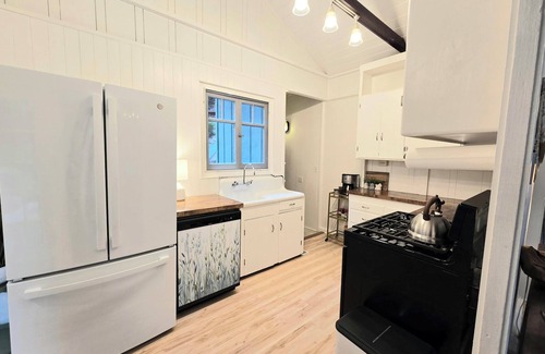 Your Home Away from Home: Retreat to your cozy haven. This fully-equipped historical rental boasts modern amenities, comfortable furnishings, and breathtaking views of towering Coast Redwoods.