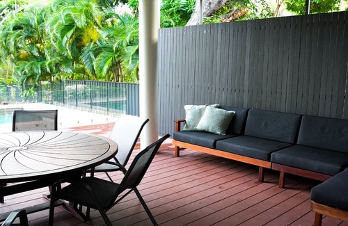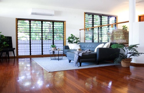 Picnic House is a luxuriuos and comfortable home, set amongst tropical gardens in a quiet street in Picnic Bay. This beautifully designed, split level home features high ceilings and louvered windows to catch the island breeze and let in an abundance of natural light.