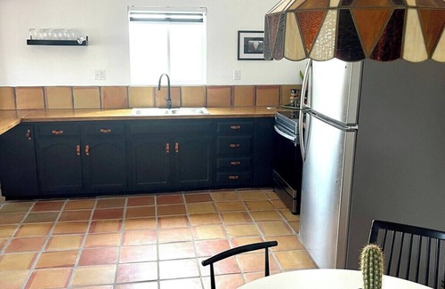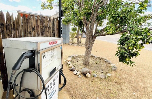 "Tuff's Place" is one of four units recently renovated inside an old gas station. This particular unit, D, is a three bedroom one bath private living oasis with sleeping for six (6) guests. Western whimsical style will have you and five of your friends "yee-hawing" all over town. Saddle up your electric ride and charge her up at the EV pump. Although this is a totally private living space there are shared outdoor spaces perfect for meeting other travelers and making new friends.