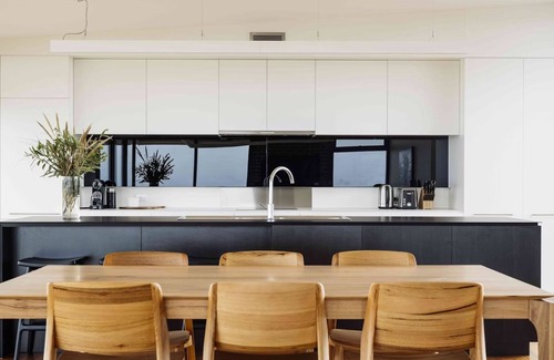 A dream kitchen with a large island is fully equipped with quality Miele appliances, cookware and provisioned to help a creative cook prepare a mouth-watering meal using the best of King Island's produce.