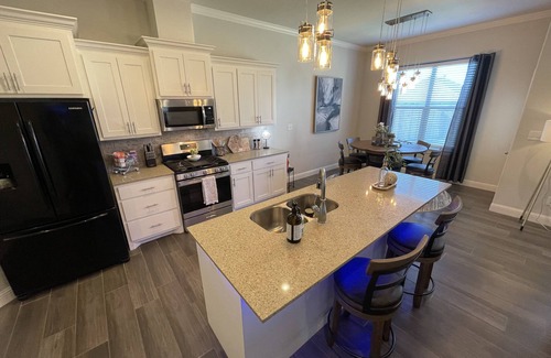 Stainless steel appliances including a refrigerator/freezer, microwave, dishwasher (pods provided), washer & dryer (detergent provided), oven, and gas cooktop. Plates, bowls, cups, wine glasses, silverware, knifes, pots & pans, and other cooking utensils are included. A Keurig coffee bar is also pre-stocked.
