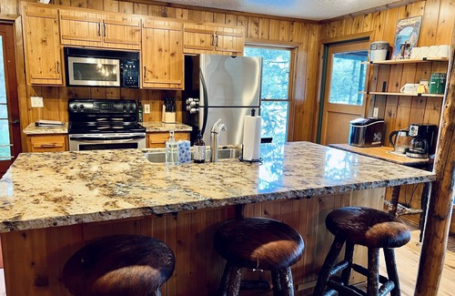 Cabin is located down a dirt road at the bottom of a small hill off the main road. The bunk house is accessed through a door on the lower patio and does not connect to the upstairs from inside.