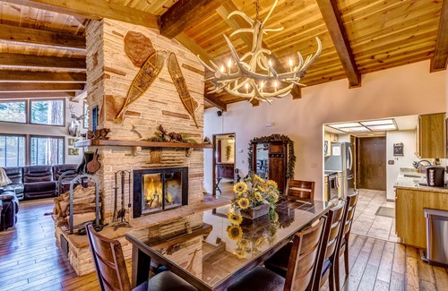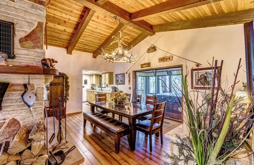 Want to keep your teenagers busy? Let them enjoy games of ping-pong in the oversized garage or simply enjoy our hot tub in the privacy of a covered Arizona room with a view of the forest. This tranquil, 'cabin feel' home boasts a floor-to-ceiling 2-sided wood-burning stone fireplace, located between the living and dining area. Vaulted wood-beamed ceiling overlooks the living and dining areas. Spacious seating for 8 at the dining table, with cushioned leather bench on one side of the table to seat lots of kiddos. Bring the family together with our cozy 7 pc leather sectional, while watching Netflix movies on our new 70' Smart TV, new Samsung sound-bar that is bluetooth, and the Yamaha FM Home Stereo will add to your overall enjoyment of this stylish home. We have Aspen log furniture in 2 of 3 bedrooms, with Serta Waldorf Astoria mattresses on both queen beds with 1000 count thread sheets. Use our Belgium waffle maker to delight your guest/family with fresh waffles from the newly remodeled kitchen. Free Wi-fi included.