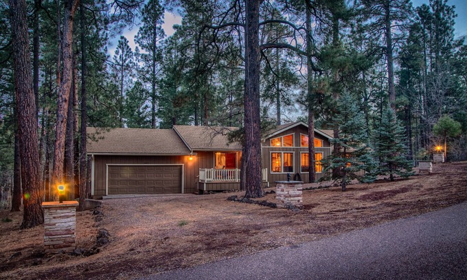 Come to this quiet neighborhood and enjoy this custom-built 3 bdrm, 2 bath home located down the street from the Pinetop Country Club. Relax on our hammocks as you enjoy a 180-degree view of the Indian Reservation forest, and enjoy your own privacy. Bring your pets and let them play in the fully fenced dog run and/or let them run freely between the dog run, 2 balconies, and Arizona room. Evenings are for hot tubbing, with the new forest lights on, for occasional wildlife viewing, relaxing at the campfire pit, located on the back corner of our property. You will find 2 back decks and 1 front deck. All of our decks have chairs and end tables. One deck holds a full-size table w/chairs, good for card playing, chess (provided), and dining. BBQ on our Weber propane grill.