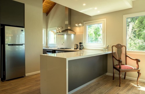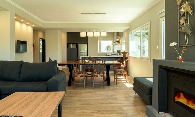Descubre el encanto y la comodidad de hospedarte en esta moderna y elegante casa ubicada en la Avenida de los Pioneros al 800, una de las principales arterias de San Carlos de Bariloche. A tan solo 5 minutos del centro de la ciudad, este alojamiento es ideal para disfrutar en familia de una experiencia inolvidable en uno de los destinos más hermosos de la Patagonia. Esta acogedora propiedad cuenta con dos habitaciones diseñadas pensando en tu confort y privacidad. La suite principal ofrece una cama doble y un baño en suite con jacuzzi, perfecto para relajarte después de un día de aventuras. La segunda habitación, equipada con dos camas individuales y un sofá cama, es ideal para niños. Además, un segundo baño completo asegura la comodidad de todos los huéspedes. El living, con su amplio sofá, es el lugar ideal para compartir momentos de ocio y relajación en familia. Equipado con una TV de 55 pulgadas y una acogedora estufa a leña, este espacio invita a disfrutar de tardes de películas o charlas junto al fuego. La casa está climatizada con loza radiante, garantizando un ambiente cálido en cualquier estación del año. Además de contar con todas las comodidades modernas, como smart TV en cada ambiente e internet de alta velocidad, la casa está equipada con una cocina completa que incluye lavavajillas, microondas, horno, y otros electrodomésticos esenciales. Los utensilios básicos de cocina, vajilla y cubiertos están también a tu disposición para que puedas preparar y disfrutar de tus comidas cómodamente. En el exterior, disfruta de una parrilla y un espacio de patio o balcón ideal para asados o simplemente para relajarte al aire libre. Además, la propiedad ofrece estacionamiento gratuito, tanto en la propiedad como en la calle. Con todos estos servicios y comodidades, sumado a su excelente ubicación, esta casa en Bariloche es el lugar perfecto para crear recuerdos duraderos con tus seres queridos. ¡No esperes más para reservar tu estancia y vivir la magia de Bariloche desde el confort de tu hogar lejos de casa!
