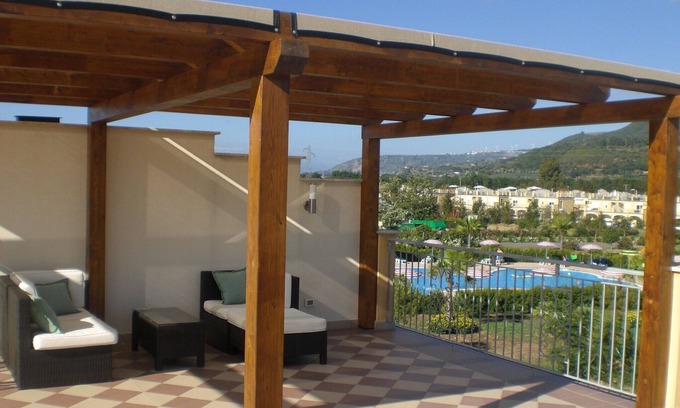 This is a 2 bedroom 1 bathroom apartment with a double pull out sofa which will sleep 5. Fully furnished to a high modern finish. All the windows have mosquito nets which is great for sleeping at night with the windows open. We have all the mod cons, all you need to bring is yourselves. The apartment is on the 1st floor and has 2 terraces, 1 off the kitchen/living room with an awning, perfect for breakfast and the other on the roof the full size of the apartment with a pergola shaded area with seating area for when it gets too hot. We get the sun all day if you want with the choice of the 2 terraces. There are also 2 sun loungers for sunbathing with a view over 1 of the swimming pools. We have air conditioning in the the living/kitchen area and both bedrooms also. The property is on the beach side of the development and is a short walk to the beach as well as 1 of the swimming pools ( which you can see from the bedroom window). Our apartment has it's own private WIFI for a better signal.