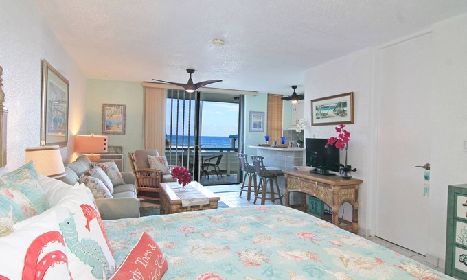 This is one of the very few OCEANFRONT STUDIO condos for vacation rental at Bolongo Beach, St. Thomas USVI. This NEWLY REMODELED SPACIOUS Studio condo with KING bed, Living/Dining furnishings, full Kitchen, A/C, 3 ceiling fans, TV with DVD player and HDMI, Wi-fi, full Bathroom with newly tiled shower and OCEANFRONT patio is located in prime Watergate Villa 16, which has 1st floor walk-out access to the BEACHSIDE POOL. Just freshly painted and remodeled for all new furniture, linens and other personalized amenities.