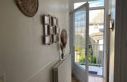 Upstairs, a landing, a bedroom (with a double bed (140 cm)) opening onto a balcony with a small sea view, a bedroom with two single beds (2 x 90 cm), and a bathroom with a shower and bathtub. Maximum 4 people. Pets are welcome.