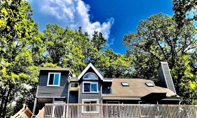 Nestled on a hilltop in Saw Creek Estates, w/ a spectacular view of the beautiful, wooded Pocono Mtns & Ski lift, The Pocono Lofthouse is a warm, comfy & cozy A-framed home. Surround yourself with nature, adventure, tranquility, an amenity-filled private gated community w/ 4 outdoor pools, 2 indoor pools, nearby Shawnee Mtn, Camelback Mtn, Kalahari, & Delaware Water Gap. Relaxing by the fire pit, indoor/indoor games, make it a perfect retreat for romantic getaways, friends, or family gatherings.