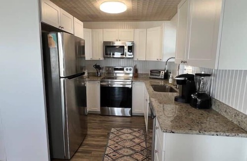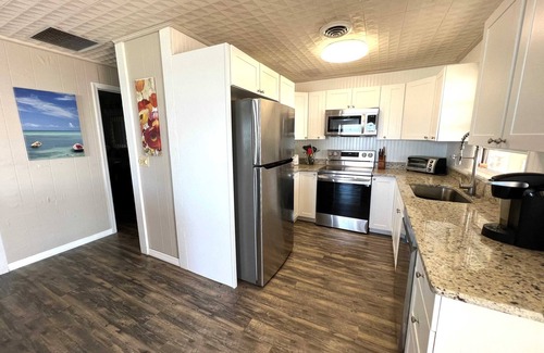 Inside, the kitchen is newly renovated with stone countertops and new stainless appliances. The view from the kitchen sink is worth doing dishes for, though the home has a new dishwasher! Two bedrooms offer queen size beds and the bathroom has double sinks for plenty of room for everyone. There are also two hammocks beneath the house, overlooking the beach, for the ultimate in relaxation!