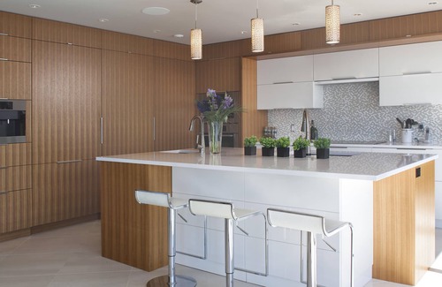 The lower living room and lounge forms the prow of the ship and opens to a large oceanfront deck. Crisp white surfaces and beautiful custom walnut cabinetry reinforce the nautical feel with lots of ship shape storage for a clean, modern look.