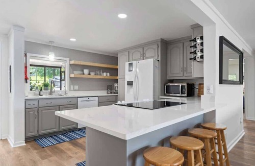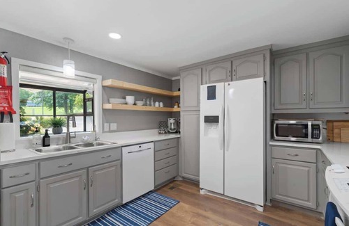 But safety doesn’t mean sacrificing comfort! Stay in and whip up a feast in our fully equipped kitchen: Dishwasher? Check! Microwave? You bet! Coffee maker with both K-cup and drip options? We’ve got you covered, caffeine addicts! Gather around the lake-facing dining table that seats eight and toast to the good life.