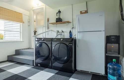 Two bedrooms with queen beds. Large living room and dining room. One large bedroom with king bed on top floor accessible with spiral staircase that may not be appropriate for guests with mobility issues or small children. Large garage with extra refrigerator and washer and dryer. As well as room for kayaks, bikes, or other toys guests may bring.