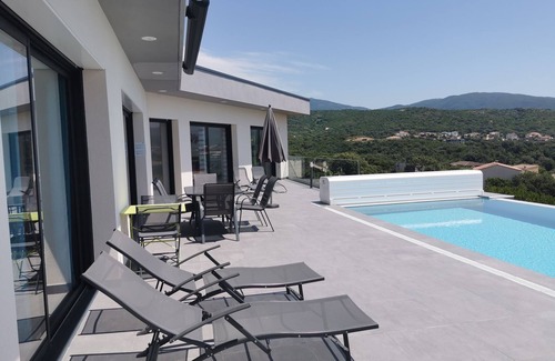 Villa "Eclat de Mer" is a brand new contemporary villa with private heated pool located at the exit of the seaside resort of Porticcio and 15 km from Ajaccio airport (south side), 7 minutes walk from the beautiful beach of Agosta, which allows everyone to enjoy the pool or the sea according to their desires