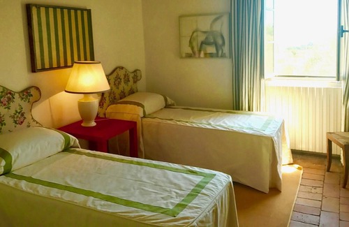 Added to the indoor comforts, are what one most desires in a Mediterranean Holiday, and that is comfortable outdoor living. Under a wisteria-covered pergola there is plenty of casual outdoor seating with upholstered cushions and pillows, and not one but two dining tables and chairs to seat 14. If you are not looking for shade, there is a well furnished terrace, too, surrounded by cyprus, lavender and rosemary and at the end of the garden, a refreshing pool. The house comes with 12 hours of maid service per week. A cook is possible on request.
