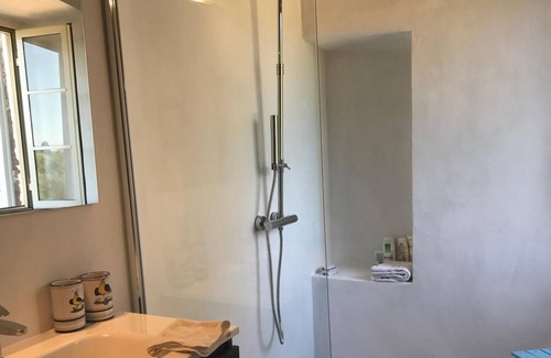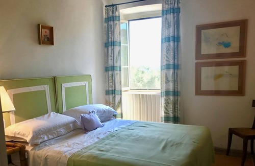An Italian Artist and her New York Art and Antiques Dealer husband took on the restoration of her family's historic, three-story 18th century farmhouse on a magnificent Olive Estate to create the perfect family vacation home, the results are splendid. The house has original beautifully polished, terracotta floors, high ceilings and beautiful proportions. The villa sleeps 11 in 5 bedrooms, now all air-conditioned,plus a bed-sitting room suitable for a child. In addition to the Master bedroom, all other bedrooms may be made up as a king bed or as two twin beds. There are three bathrooms all with tub/showers, plus a half bath. The kitchen has everything that you could wish for! Dishwasher, microwave, full stove and oven, and plenty of room to cook great family meals. There is a large living room with fireplace for fall and winter evenings, a charming sitting room, plus upstairs den. There is also a separate dining room with antique table. And as you might expect, antique furnishings abound through-out.