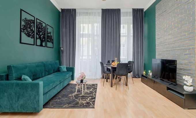 This unique 54.44 m² apartment will comfortably accommodate 5 people. It is an excellent choice for a stay in Lodz with a group of friends or for business travellers. The apartment charms with its design, which is a combination of shades of green and grey, creating a modern yet functional arrangement. Tastefully selected accessories give the interior character and express the apartment's individual style. The layout of the rooms includes a kitchenette, living room, bedroom, balcony and bathroom with bathtub. The living area with access to the balcony is a cosy space that encourages you to spend time with your loved ones. A soft, comfortable sofa with a sleeping function is the perfect place to relax. Large windows fill the room with light, emphasising the unique character of the interior. The kitchenette, equipped with high-quality appliances, provides the possibility to cook home-cooked meals. A comfortable, spacious bedroom with a comfortable double bed invites you to rest after a challenging day. A sofa bed provides additional sleeping space for one person. The furnished space with a desk will be ideal for working or studying at the computer. The bathroom is equipped with a bathtub, a hairdryer and a washing machine to increase comfort during a longer stay. Evening entertainment is provided by multimedia, such as two flat-screen Smart TVs, as well as free Wi-Fi access. Guests are provided with complimentary toiletries, towels and bed linen for a good start to their stay. Pet-friendly venue.
